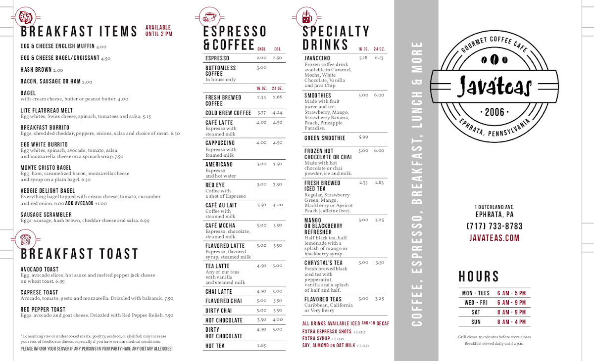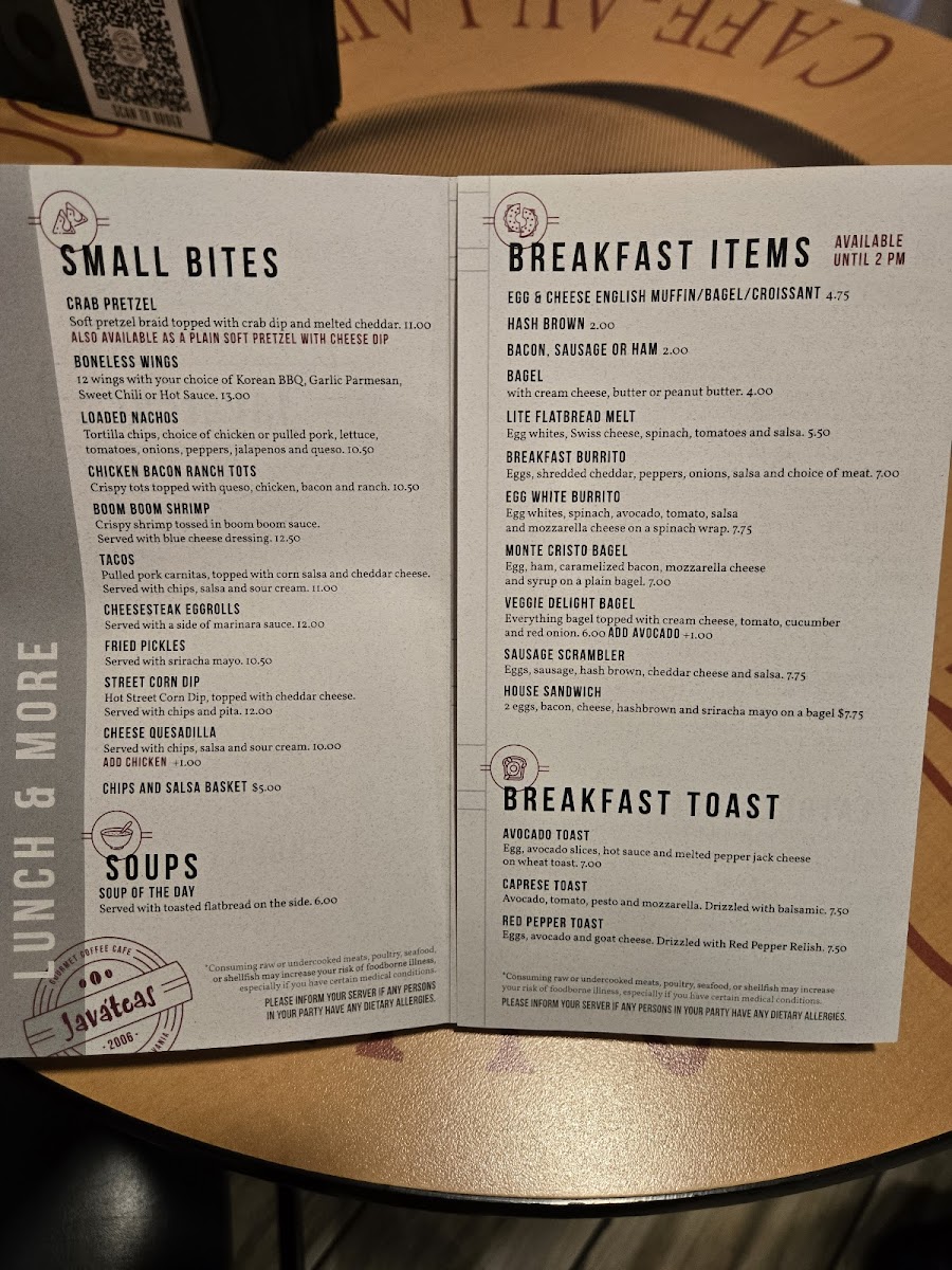 Welcome to Javateas Gourmet Coffee Cafe, a delightful spot nestled at 1 Dutchland Ave, Ephrata, PA. This vibrant cafe offers a delectable all-day breakfast menu featuring options like the fluffy Egg & Cheese Croissant and customizable bagels. Whether indulging in the savory Egg & Cheese Bagel or classic English Muffin, there's something for everyone.